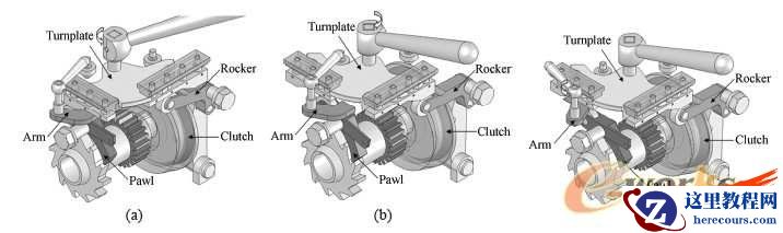 逆时针扳动小手柄,带动拨叉下压止动臂上端部的轴承,抬起止动臂棘爪,解除棘轮的锁紧状态。此时通过转动手轮来控制提升管的升降,驱动切换部件处于手动状态(见图2(c))。