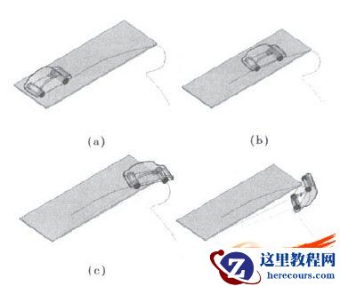 下面是运行过程的几个片段,图6(a)是行驶开始位置,图6(b)是运行到4.2 S时的状况,图6(C)是运行到6.3 S时的状况,图6(d)是运行到7.1 s时的状况。这些图像很好地显示出了汽车直线运行、转向运行以及冲出路面掉下去的全过程。
