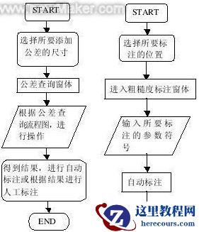 图2 为两个标注功能实现的流程图,清楚的描述了标注系统的开发过程。流程图可以引导整个开发过程,便于大型程序的模块化设计,在软件设计中是必不可少的。使用时可根据流程图所示进行操作。下面将结合实例进行具体介绍。