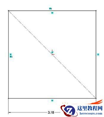 矩形草图工具用于创建 VEX 轴的轮廓。在机器人设计中,您会希望零件具有对称性。原点代表前基准面、上基准面和右基准面的交点。简单的矩形草图可从原点开始绘制,但是,如果您将原点置于草图中心,则草图将保持关于上基准面和右基准面对称。在矩形的两个顶点间连接一条辅助线,并在原点和该中心线间建立中点关系,将可确保矩形始终对称。