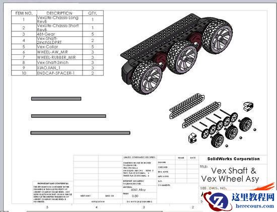 工程图包含用于记录零件或装配体的信息。您可将在零件图或装配图中定义的配置和属性插入到工程图中。例如,VEX 轴采用 6061 铝合金,该零件在相应的工程图中包含三种配置,材料 6061 铝合金会自动出现在标题栏中。您还可以将在零件图中标注的公差信息传递到工程图中。
