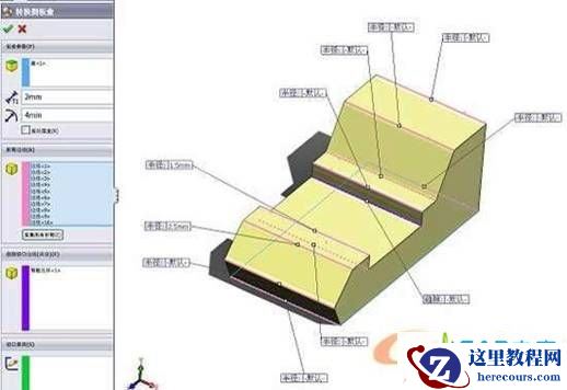 根据左边编辑器的设定,我们需要给它指定:一个固定的面,输入钣金参数;按折弯的顺序来选择折弯的边线,每个折弯处可以指定不同的折弯半径;它还会自动识别出需要"切口"的边线(要是没有切口,该钣金件是不能展开的)。最后,只需要温柔地点击一下确定,就能够生成图4中所示的钣金零件了