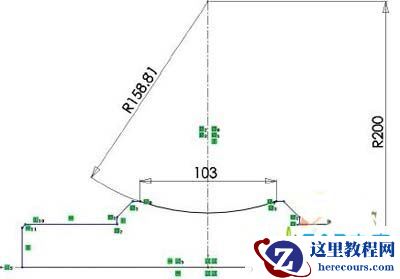3) 绘制圆弧,圆弧圆心在中心线上,圆弧两端端点以中心线A1对称;