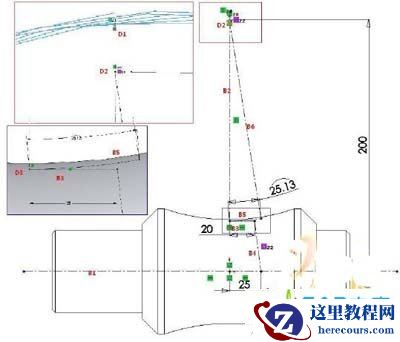 6) 以B3右端点为起点绘制中心线B4,B4的另一端点在B1上,选择B4与点D2添加几何关系——重合,标注原点与B4下端点的距离为25,此时草图完全定义;
