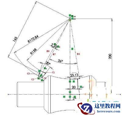 9) 以D2为起点绘制中心线B7,B7与B6 成36°,B7长度为165;