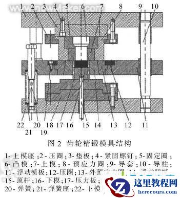 由于传统的锻模结构存在锻件填充性差、变形抗力大等缺陷,为改善齿部的充填性能,降低变形抗力,采用浮动凹模代替传统的固定凹模,改善模膛的充填性该模具工作部分主要由凸模、上模、下模和浮动凹模组成,并具有一定的通用性,只要改变浮动凹模的形状和尺寸就可用丁其它型号的圆柱齿轮生产。