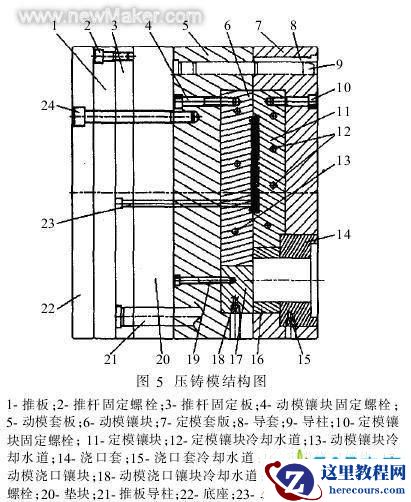 模具结构如图5。模架采用45钢;顶杆采用SKD61钢,这种材料具有极好的高温性能,是压铸模的优质顶杆。