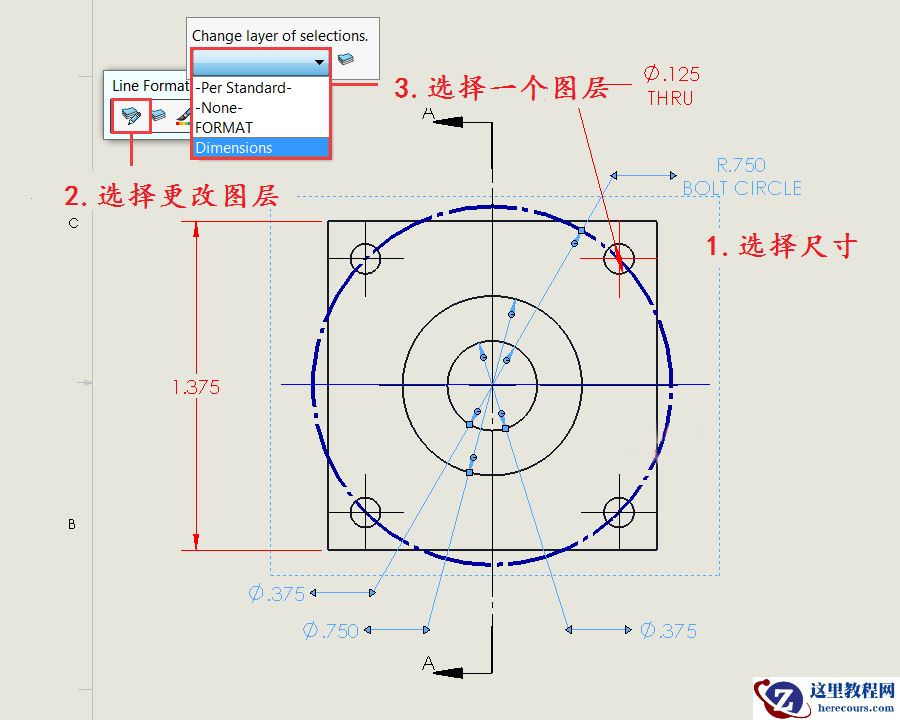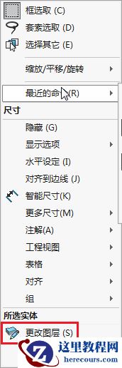 然后选择要添加到图层的尺寸或者注释,并选择更改图层按钮,并从选择框中选择一个图层。 然后,尺寸将更改为图层的应用颜色。