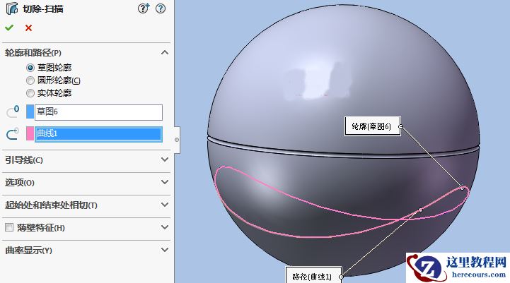 9.点击【扫描切除】,依次选择上一步的草绘截面和投影轨迹。