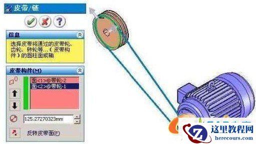 激活【皮带构件】列表,选择用于定义皮带直径和位置的圆柱面或圆形边线。如图4所示,这里选择两个皮带轮对应的圆柱面。