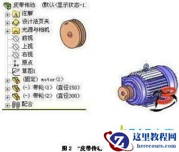 打开装配体文件,如图2所示,装配体中已经插入了所需的零部件,针对两个皮带轮建立了配合关系,确定了皮带轮的位置。