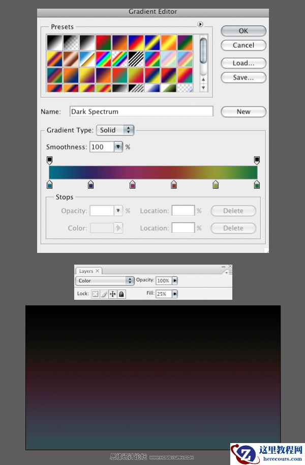 在之前的图层之上创建另一个线性渐变调整层,你自己选择彩虹的颜色。这有一些五颜六色的预设,你可以在渐变调色板上选择,或是自己创建。设置层填充降到25%。然后设置图层的混合模式为颜色。