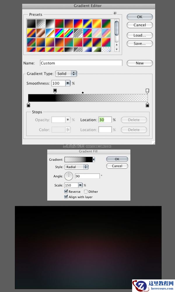 最后在之前的两个图层上再创建一个渐变调整层。这次用径向渐变。设置颜色从黑色到透明(100%到0%)。
