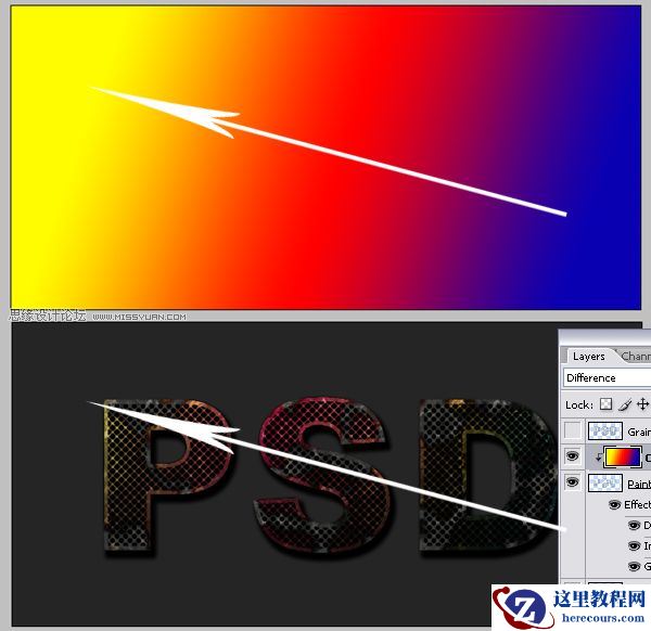 在”着色”层上新建一层命名为”颜色”.选择渐变工具,打开线性选择工具,选择:蓝色,红色,黄色。设置为线性渐变并按如下方式填充图层。按下ALT键,点击“着色”和“颜色”层中间的分隔线,以将“着色”层定义为剪贴蒙板。将“颜色”层的混合模式改为差异。