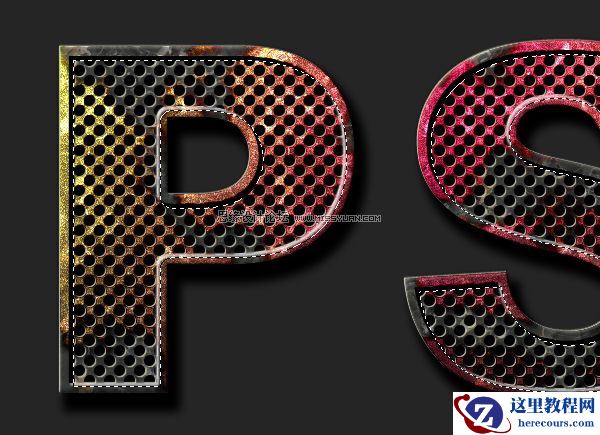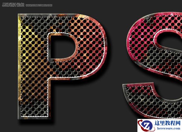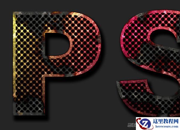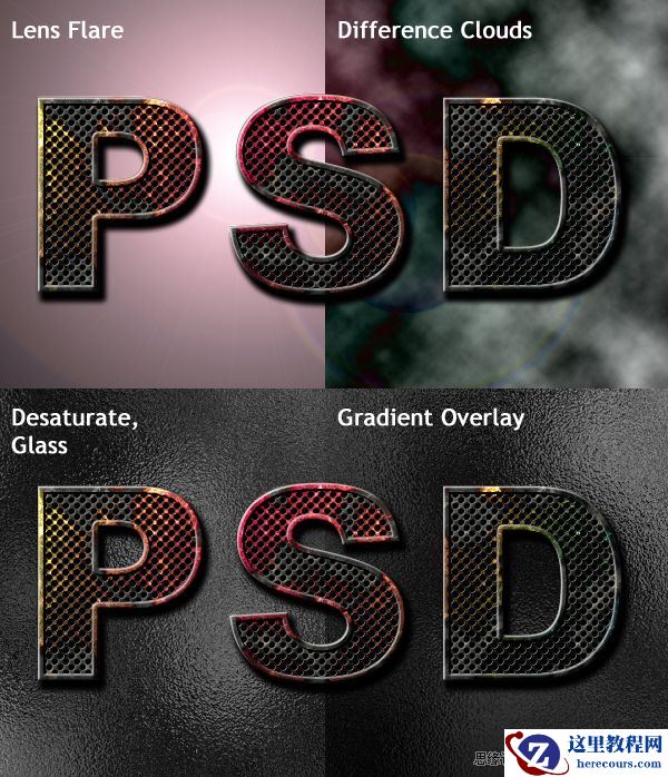 通过改变渐变和“颜色”层的颜色,以及改变“文字”层的图案叠加样式的纹理,你可以实现各种效果。