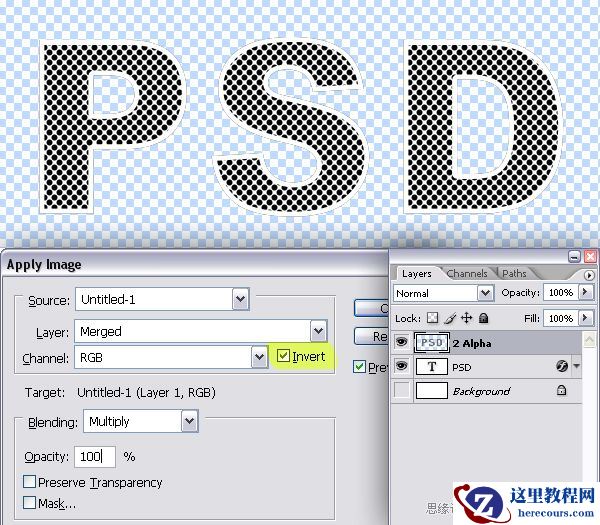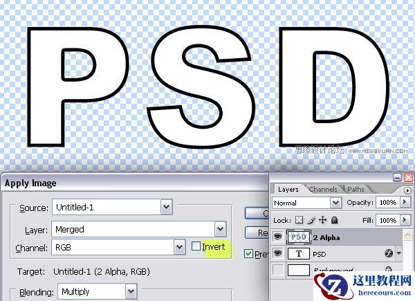 在最上面建立新层,再次命名为“2 Alpha“因为这个层将作为alpha通道。确保背景层仍然为隐藏。执行图像〉Apply Image and uncheck Invert