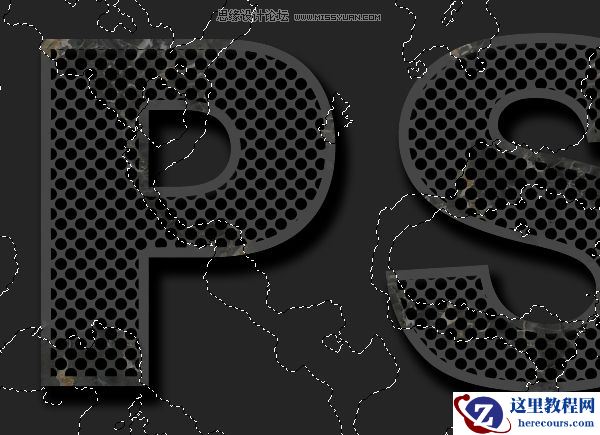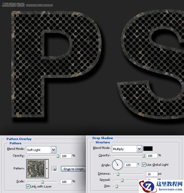由于我们的最终图上是黑色背景。那么最好现在就将背景调暗。将背景层填充为90% 灰度。现在对“文字“层应用2种样式。第一种为图案叠加,设置为:柔光,不透明度100%,样式为”黑色大理石“,范围为100%。第二个样式为投影。设置为:正片叠底,100%不透明度,角度为120。距离16像素,平铺30%,大小为15像素。