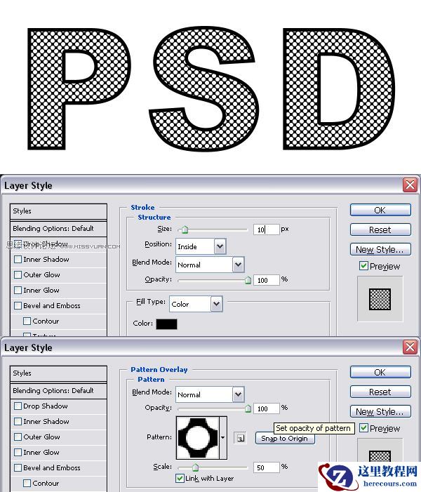 现在我们将应用两种图层样式。首先应用描边(Stroke)样式,设置如下:尺寸10像素,位置为内部,混合模式为正常。不透明度为100%,颜色为黑色。然后应用图案叠加样式(Pattern Overlay),设置如下:混合模式为正常,不透明度100%,样式设置为“孔”,比例设置为50%。