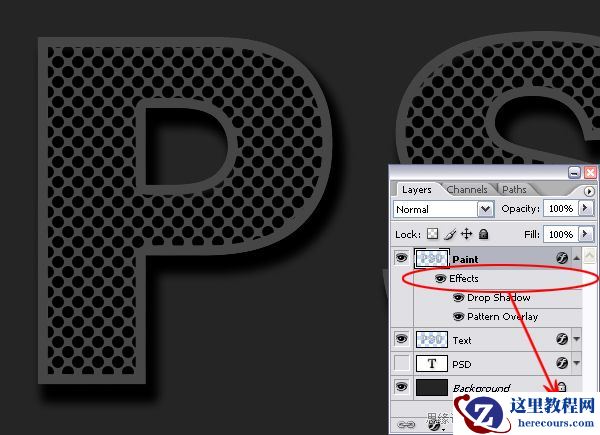 进入图层面板,现在我们不需要“2 透明”这个层,所以将它删除。将PSD层的图案叠加样式设为隐藏,将文字颜色设为白色。这里图层命名为PSD是因为我们输入的是PSD。你可以按你自己的文字命名。