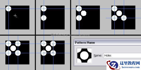 将选区填充为白色,拖出一条水平和垂直辅助线置于选区的中心。按下SHIFT键并保持,按4下方向键将选区向下移动40像素。填充为白色。现在将选区向上和向右分别移动20像素,再次填充白色。接下来将选区向下和向右分别移动20像素并填充白色。