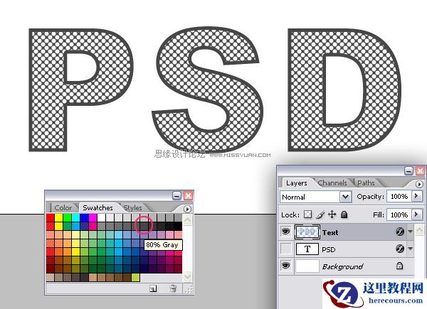 进入到图层面板建立新层命名为“文字“,通过ALT+退格键将前景色设置为80%的灰度。然后取消选择。