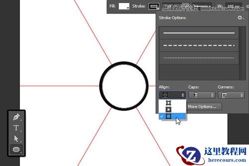 选择椭圆工具,在画布中心点创建366*373像素的椭圆。在选项栏中,设置填充颜色为白色,描边颜色为黑色,点击描边选项按钮,改变对齐样式为外对齐,设置如下图所示。