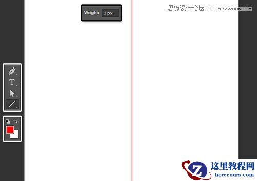 创建新文档,长宽为500像素*500像素。选择直线工具,设置前景色为红色,在选项栏中设置宽度为1像素。在画布的正中央画一条直线,贯穿画布上下。