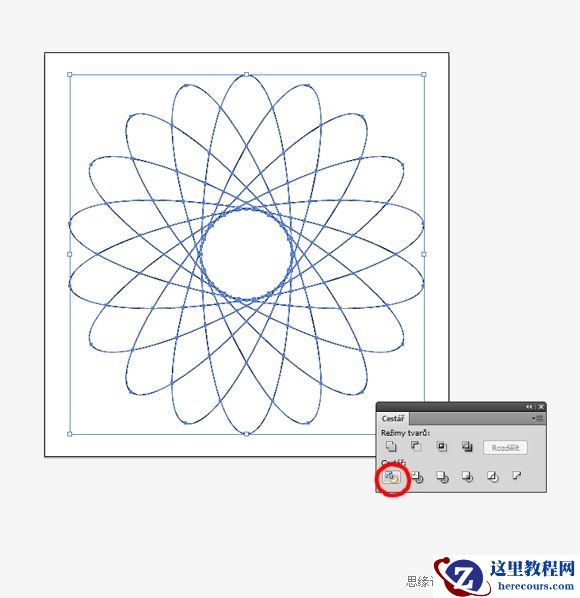 我们现在可以删除辅助线,我们不再需要它们。本教程最容易的部分完成了,现在我们需要把它划分成小块。我们将使用路径查找器。因此,选择所有椭圆,去窗口>路径查找器,点击分割: