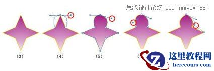 4、单击工具箱中的“转换描点工具”按钮,在星形的控制点上按下鼠标左键拖曳,此时将在控制点的两侧出现控制柄,状态如图(4)