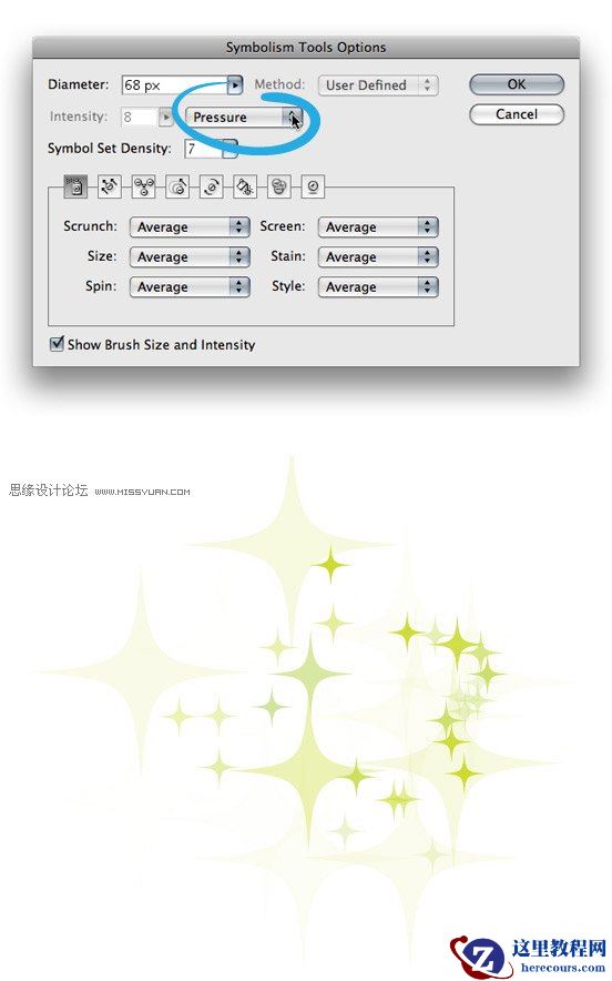在符号喷枪工具选项中,可以使用与书法画笔中一样的写字笔选项来设置喷枪强度。在工具箱中双击符号喷枪工具弹出选项,使用写字笔选项改变强度同样会改变符号工具组中的全部符号工具。试试不同的符号组工具可以取得不同的效果,使用写字笔的这些特性能够在符号工具中产生更自然的变化,而不是静态的强度。以下是使用符号工具组的一个简单示例。