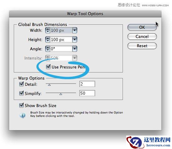 液化工具组(位于工具箱中)同样可以利用写字笔压力。液化工具包括:变形、旋转扭曲、缩拢、膨胀、扇贝、晶格化、皱褶。如果在特定的液化工具上双击会弹出选项,在选项中可以勾选写字笔压力,然后设置。