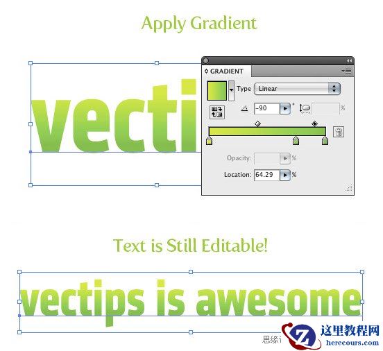 在AI中不能以添加渐变到对象的方法把渐变添加到文本中。虽然可以先把文本转化为轮廓再上渐变色,但是此后文本就不能再编辑了(译者注:比如改变字体等,因为此时文本已经被轮廓化转成矢量对象了)。别担心,还是有办法的,既能为文本添加渐变又能保持其可编辑性。