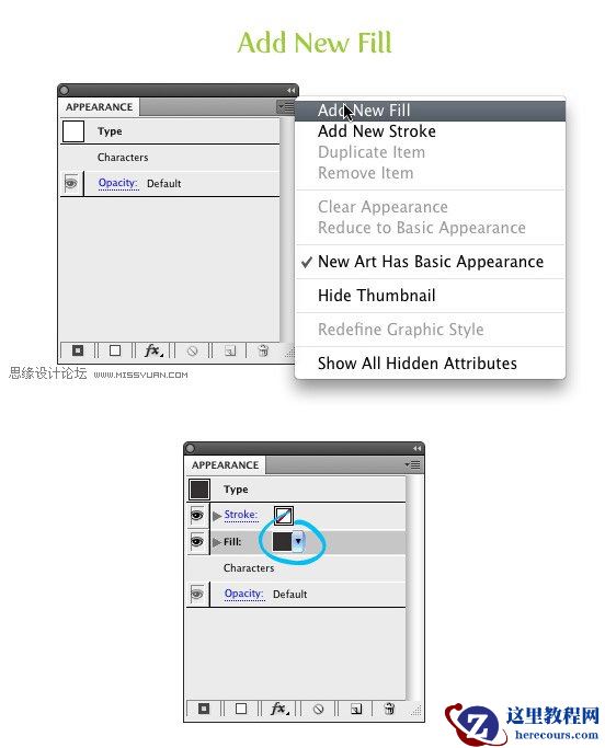 用直接选择工具选中文本,打开外观面板中的外观面板菜单(左上方的按钮),然后选择新建填充色。
