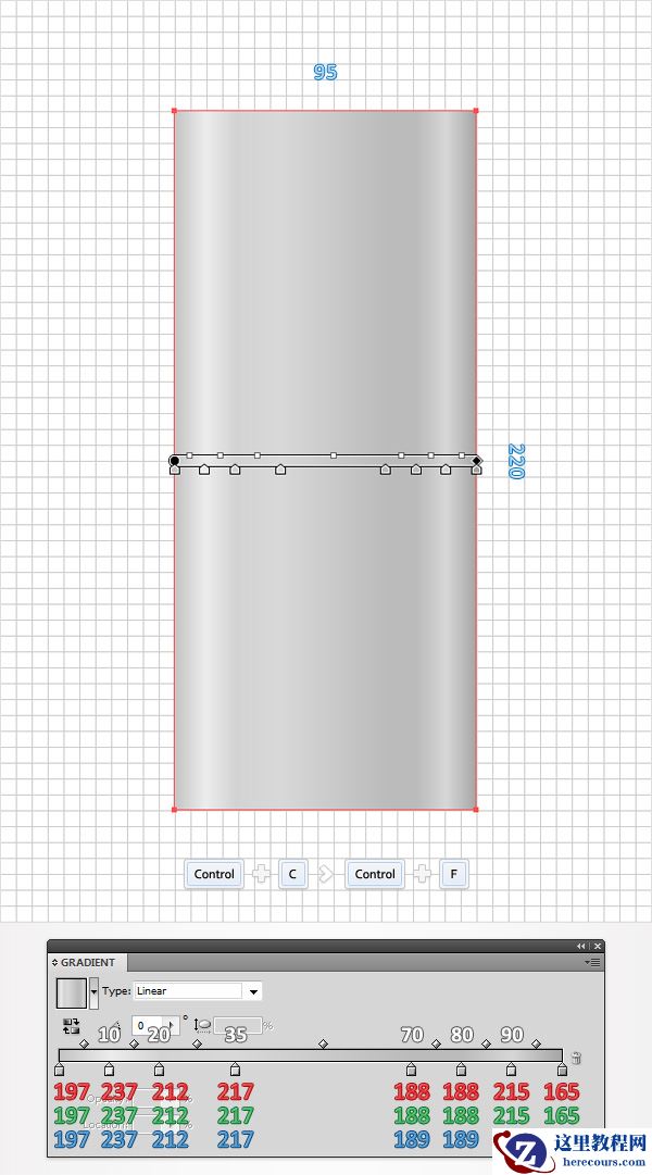 使用矩形工具创建一个95*220px的矩形,并按照下图所示填充线性渐变。渐变上的白色数字代表位置百分比。选中这个矩形并在其前面做一个副本(Control+ C < Control + F)。