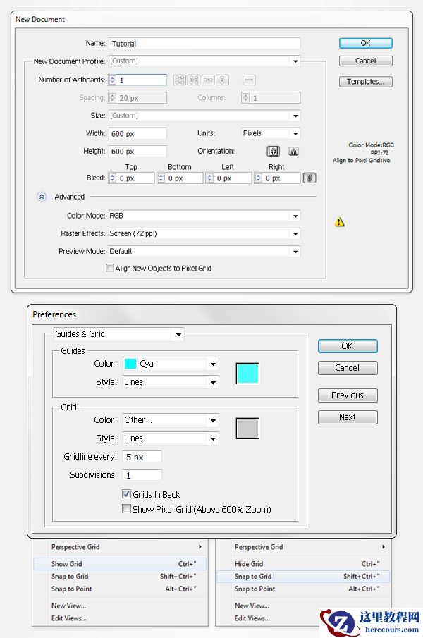 按Control+N新建文档。宽度和高度都输入600,然后点击高级按钮。颜色模式选择RGB,栅格效果选择72ppi,并在单击确定前保证“使新建对象与像素网格对其”未被选中。现在启用网格(视图<显示网格)和对齐网格(视图<对齐网格)。首先,你需要间隔为5像素的网格。单击编辑 < 首选项 < 参考线和网格 < 网格,在网格线间隔处输入5、次分隔线处输入1。你也可以打开导航器(窗口<导航器)预览形状的大小和位置。别忘了在编辑<首选项<单位<常规处把单位设置为像素。所有这些选项将会显著地增加你的工作速度。