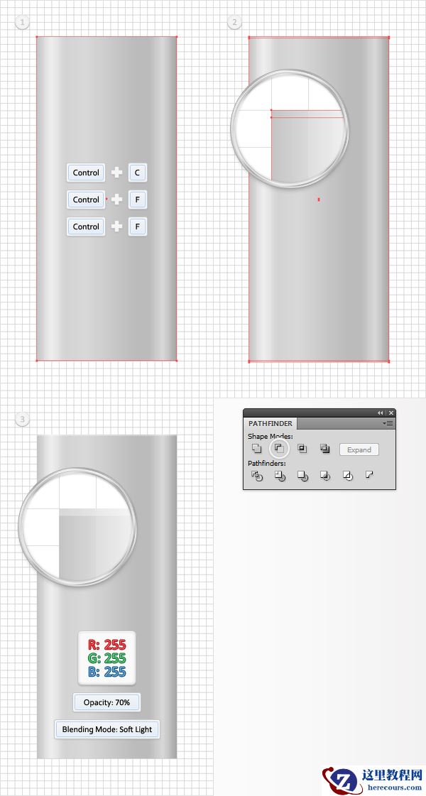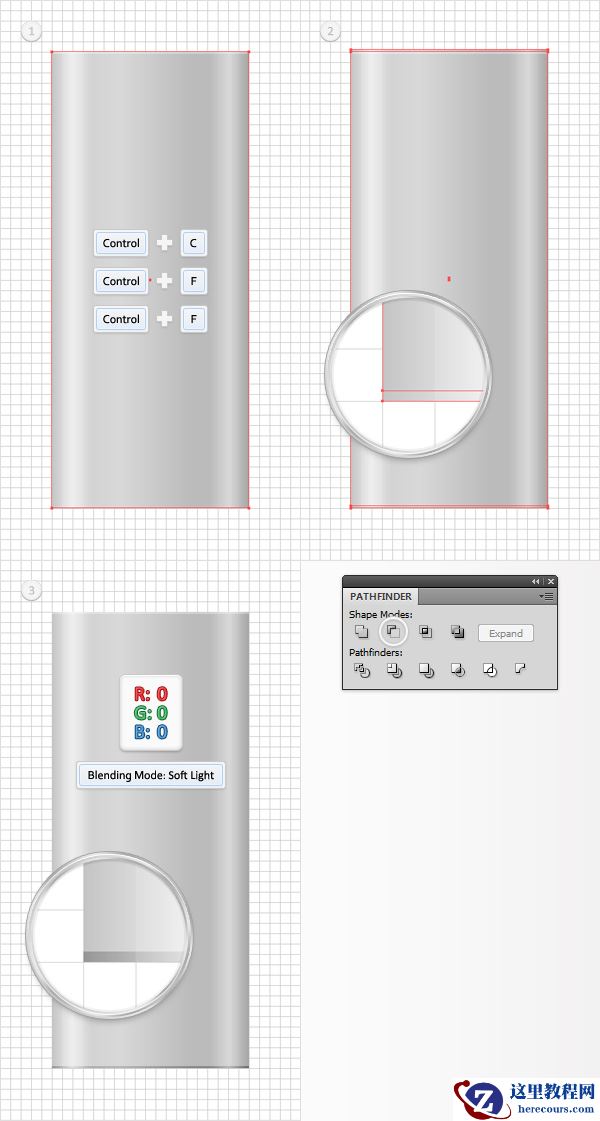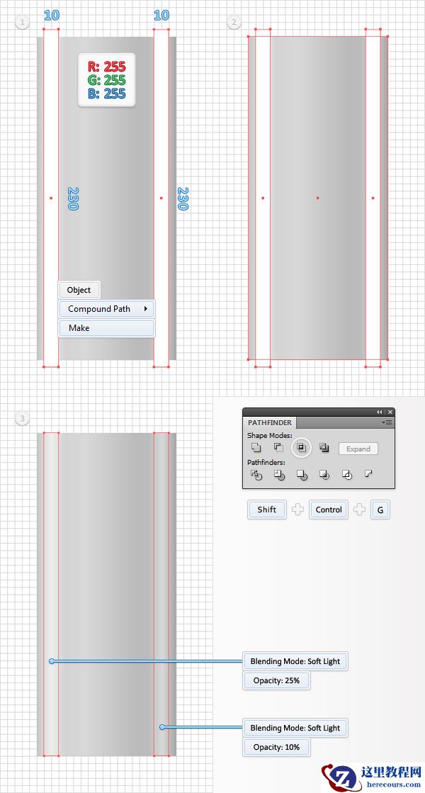 用矩形工具再创建两个10*230px的形状。这两个形状都填充为白色,并把它们放置在如第一幅图所示的位置上。选中这两个矩形并把它们转化为复合路径(对象<复合路径<建立 或 Control+8)。同时选中这个新的复合路径和上一步中最后生成的那个副本,打开路径查找器面板,单击交集按钮。选中生成的形状编组,并取消编组(Shift + Control + G)。选中左边的白色矩形,把不透明度降低至25%,混合模式设置为柔光。选中另一个白色矩形,把不透明度降低到10%,混合模式设置为柔光。