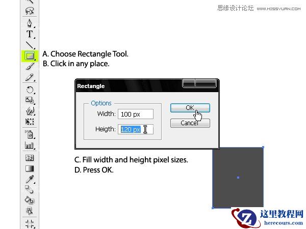 1.打开Adobe Illustrator,矩形工具,绘制一个矩形,宽:100px 高:120px