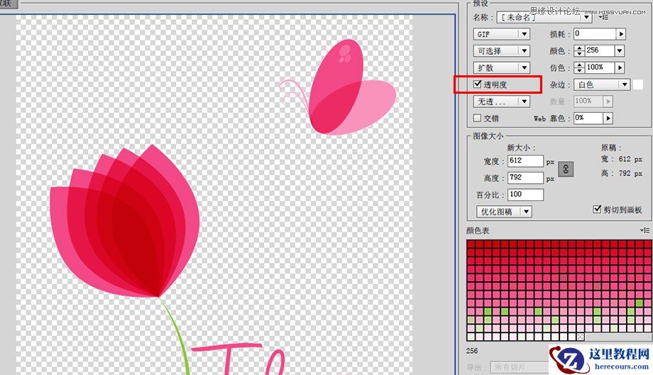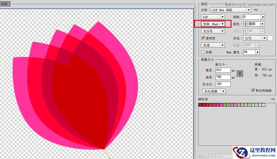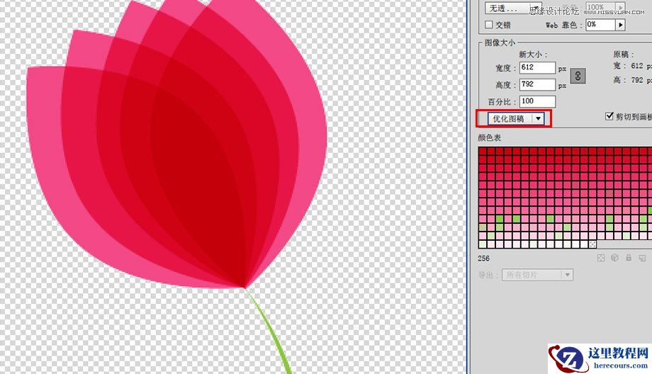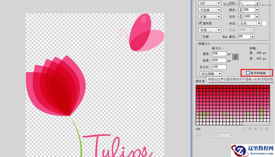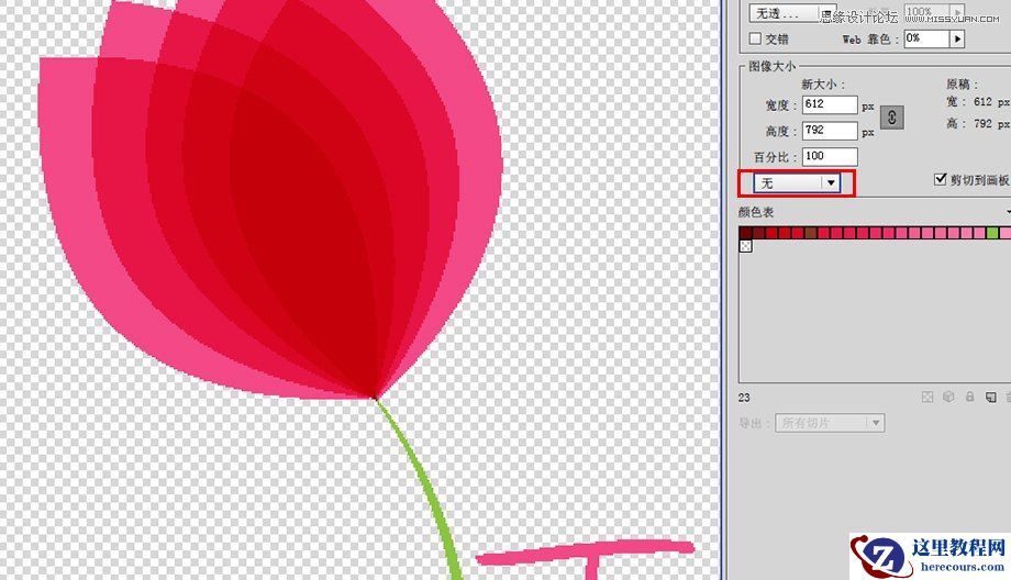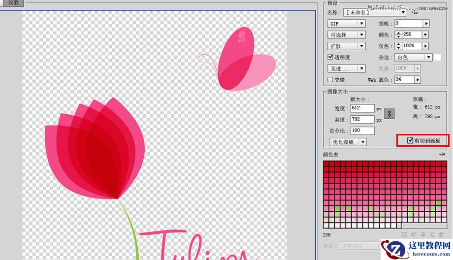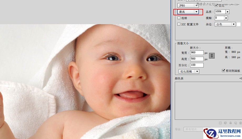 和GIF以及PNG-8一样,你可以选择图片的优化办法或者选择是否剪切图片到画板,你还可以具体设置图片的尺寸大小。但JEPG没有颜色表,因为JEPG是用的RGB的颜色模式,而不是索引颜色模式。