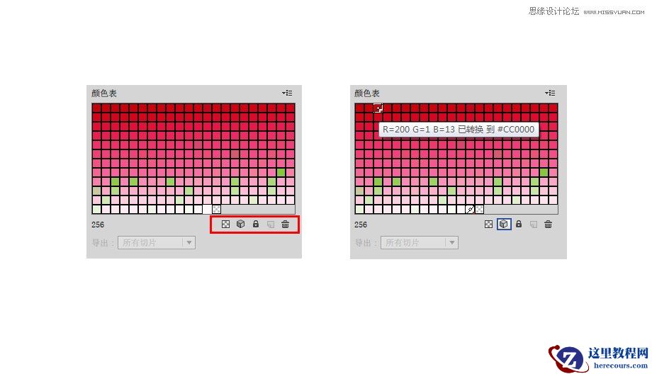 在颜色表的右下方有一排图标,这一排图标让你可以更多地对颜色进行调整。你首先需要选中某一个色板,然后进一步可以设置其为网页安全色,或者锁定或者删除它。色板中出现星号就表示已经转为网页安全色,当鼠标滑过会提示出所替换的网页安全色的色值。