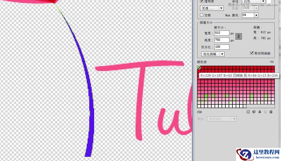 让我们继续看看右下方的颜色表,这个颜色表里包含了优化后的图片里所包含的每种颜色。其实,你完全可以通过双击修改某个颜色。就像我在本例中将绿色换成了紫色,而当你鼠标划过这个色块时,会有一行小字来提示你将什么颜色替换为了什么颜色。这种方式可以让你将一个作品保存为多种色彩的版本,而不用改变原始图片。