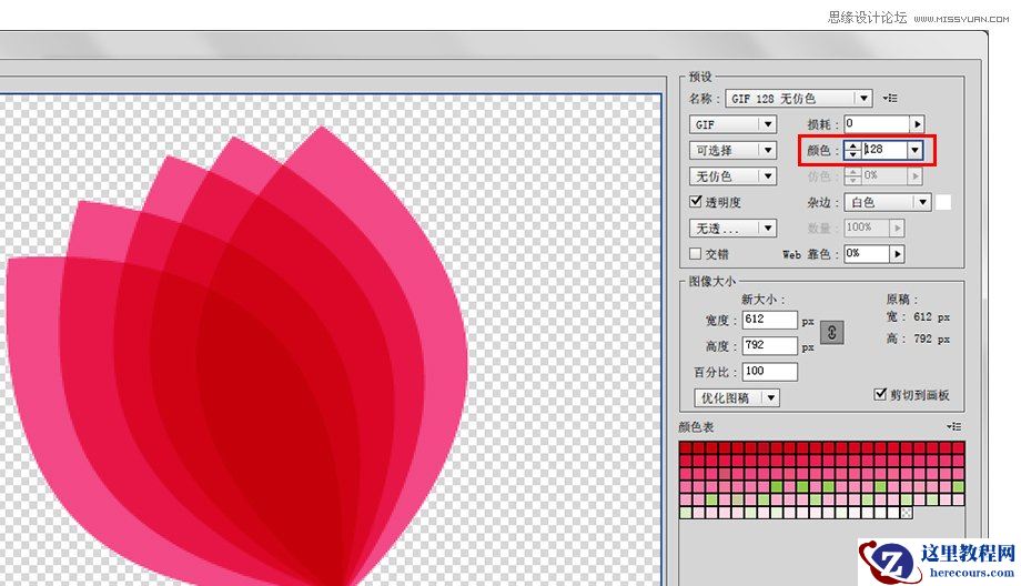 保存为WEB格式的对话框中有多种GIF的预设,你需要仔细查看不同选项下的图片的品质和图片的大小。大家可以看到我在下图中的设置,我选择了GIF的颜色为128,这时的图片的效果还不错,而图片的大小也只有13.71K。