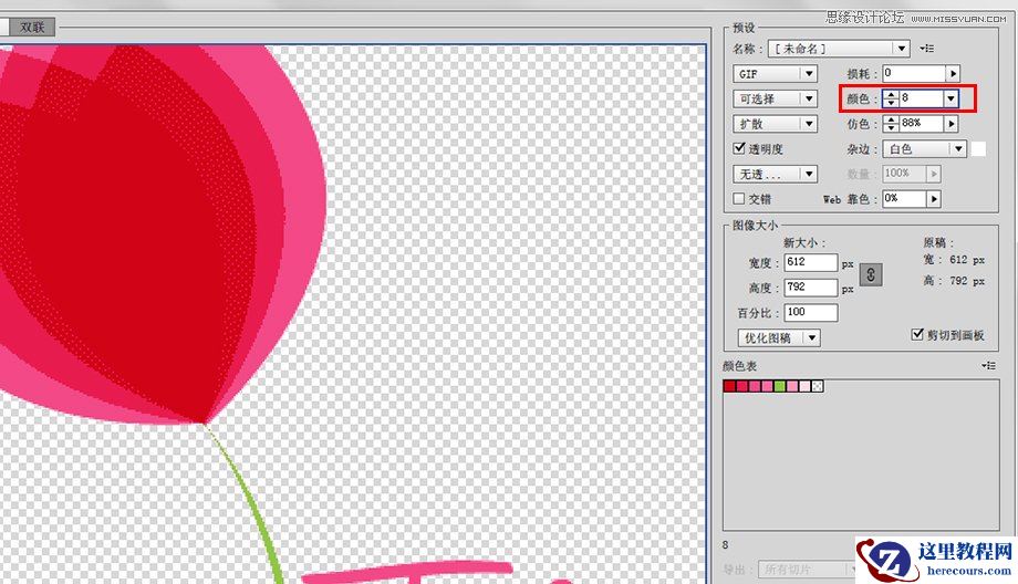 接下来让我们试着调低一下颜色的值,把颜色值设置为8,这时你会看到图片的大小变为了8.702K,但是图片丢失了品质。边缘开始出现锯齿,这时因为没有足够的颜色来支持颜色间的平滑过渡。虽然,我们在AI中只用了很少量的颜色,但AI本身的抗锯齿处理会使用更多的色彩来平滑边缘的锯齿。