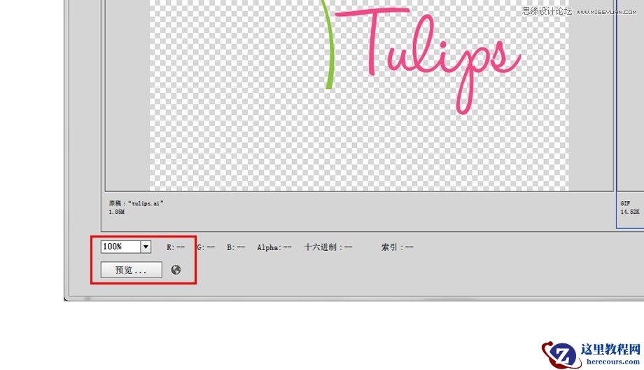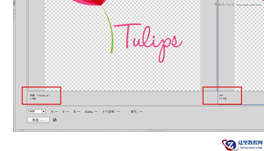 保存为WEB格式的界面中最为重要的部分就是图片大小,在每个预览图的下方都会出现这个图片的文件类型和大小。在下图中可以看到,我们的左边的原稿是ai格式,文件大小是1.85M,而右边优化后为GIF格式,文件大小变为了14.53K。既然是要在文件大小和品质之间找到最佳平衡,因此你需要时刻保持对文件大小的关注。