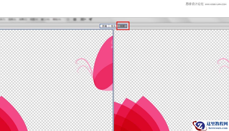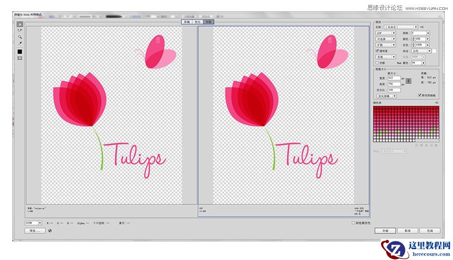你可以通过三种方式浏览你的作品。最左边的“原稿”可以简单地展示原稿效果,但由于你是要预览被优化后的效果,因此这个选项几乎没有作用。你也可以来到“优化”这个选项,在这里可以预览到优化后的效果,或者你还可以选择“双联”,这个选项会让你将原稿和优化后的作品左右对比进行预览。在下图中,左边的是原稿,右边是优化后的效果(在本例中,是作为GIF格式进行优化的)。