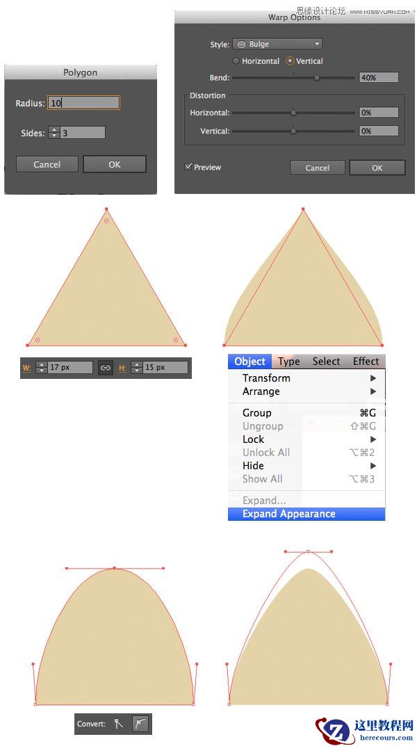 选取多边形工具并制作一个大小大约为17 * 15 px的三角形。 使用效果>变形>凸出并设置垂直方向的弯曲值为40%。