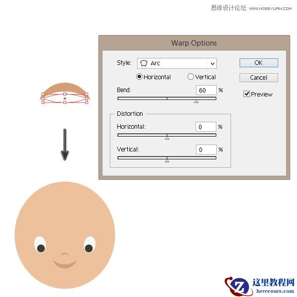 让我们创建嘴巴。 首先用一个长椭圆。 保持它被选择的状态,使用锚点转换工具(Shift-C),点击右边和左边的锚点使它变尖。 继续保持它们被选中并添加效果>变形>弧。 在新的对话窗口中,输入你在下图看到的选项: