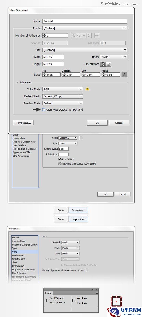 点击Ctrl+N,创建新文档 在单位下拉菜单中选择像素,同时设置宽高为600px,之后点击高级按钮。 选择RGB,屏幕(72ppi),确认使新建对象对齐到网格未处于选中状态。点击确定。