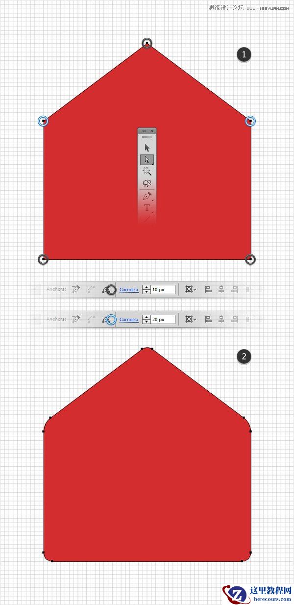我们继续调整红色形状,选择直接选择工具(A)。 选中下图中黑色圆圈圈出的三个描点,在利用圆角工具,设置10px的圆角。