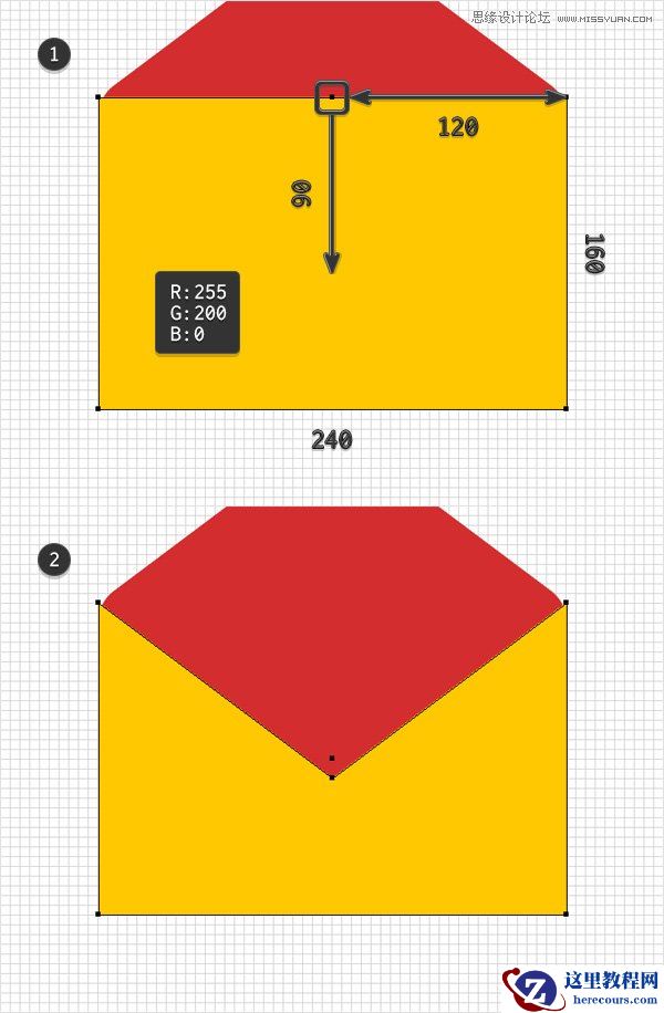 切换到直接选择工具(A),选择新添加的描点,将其向下拉90px。 最终,黄色形状应该是如图二所示。