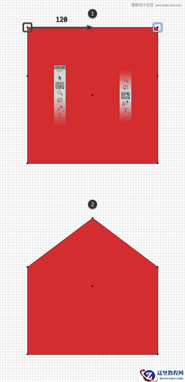 选择你的红色形状,注意顶部的两个描点。 选择直接选择工具(-),选中左边的描点,直接拖到中间位置,即距离右侧120px处。